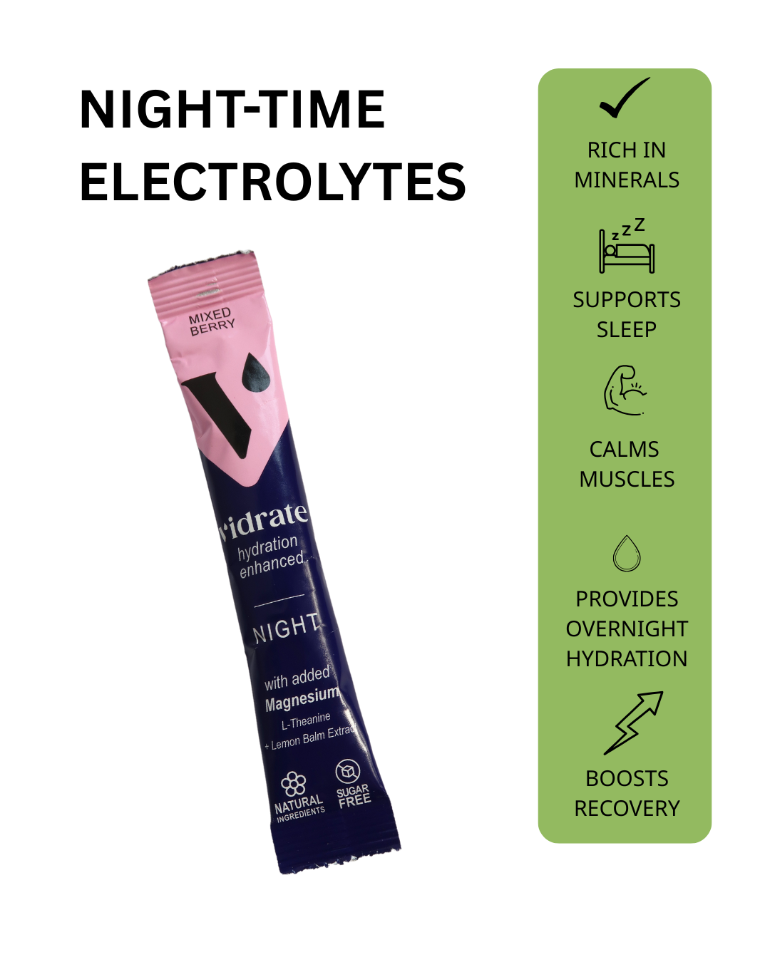Hydrates and replenishes while you rest. Supports overnight recovery. Added electrolytes + L-Theanine & Magnesium. Zero sugar flavours, sweeteners or preservatives. Mix with 300-500ml of water.