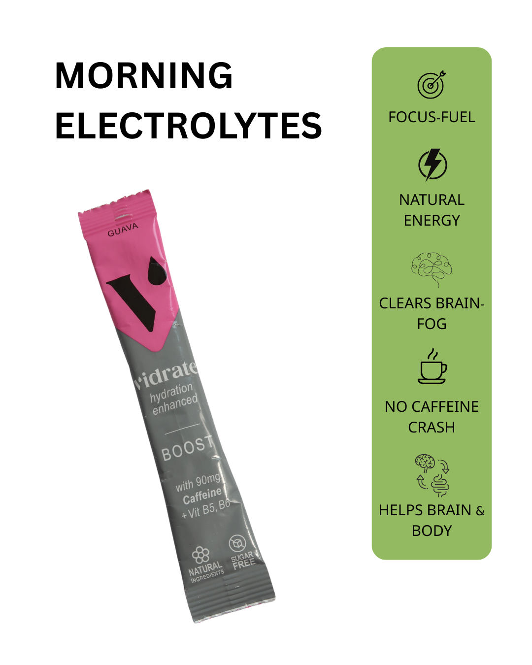 Energizing blend to kickstart the day after. Fast hydration, made up of B5 and B6, some of the most important vitamins your body needs daily. 90mg is a little more caffeine than you would find in popular Energy Drinks. perfect to give you that 'boost' of energy you sometimes need After a long gruelling night